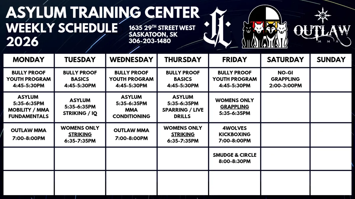 Explore the programs at Asylum Training Company—a community-first martial arts gym in Saskatoon. From beginner MMA and kickboxing to youth Bully Proof, Women’s Self-Defence, and Outlaw MMA (SAW/Judo/Wrestling), you’ll find clear progressions, coach supervision, and a respectful training culture.